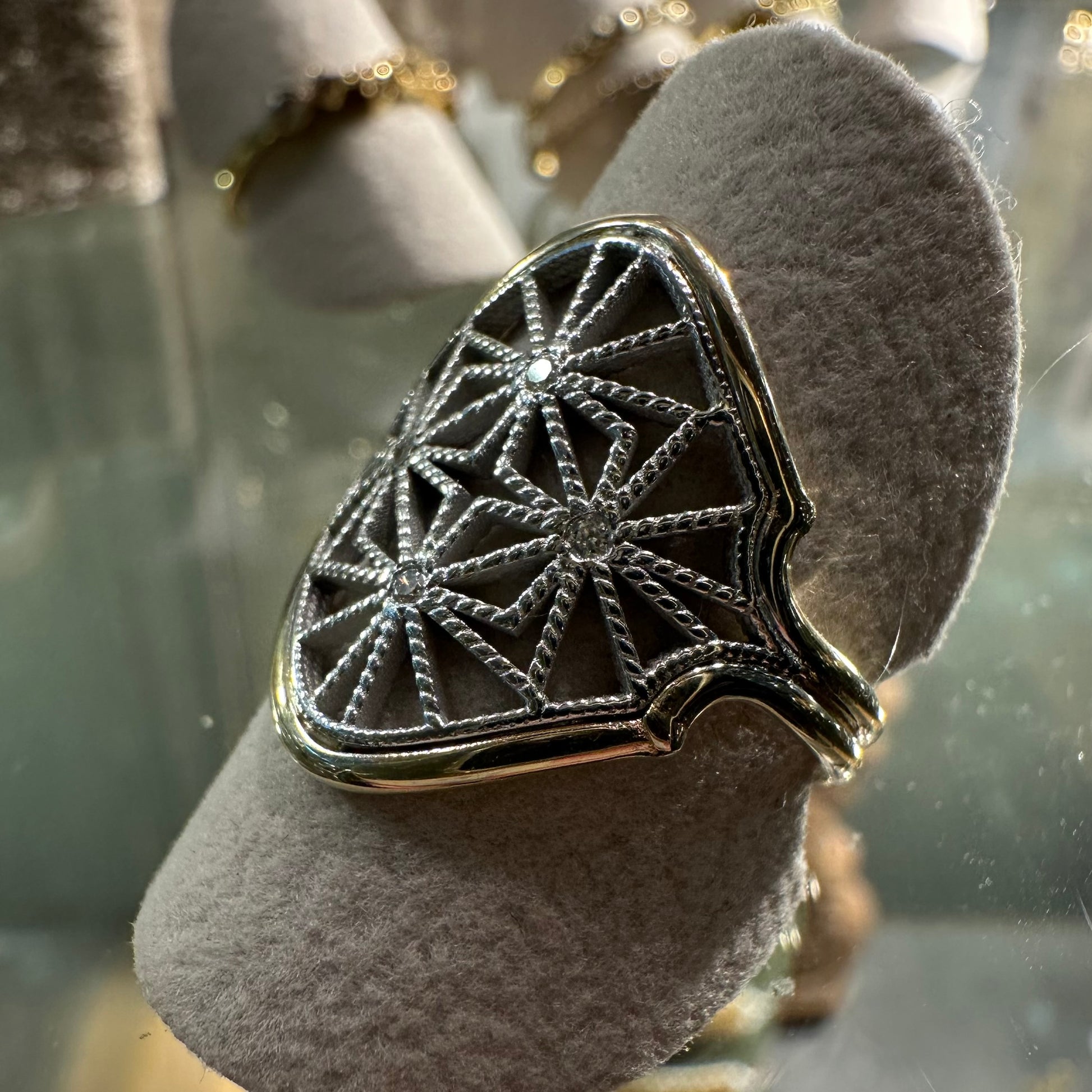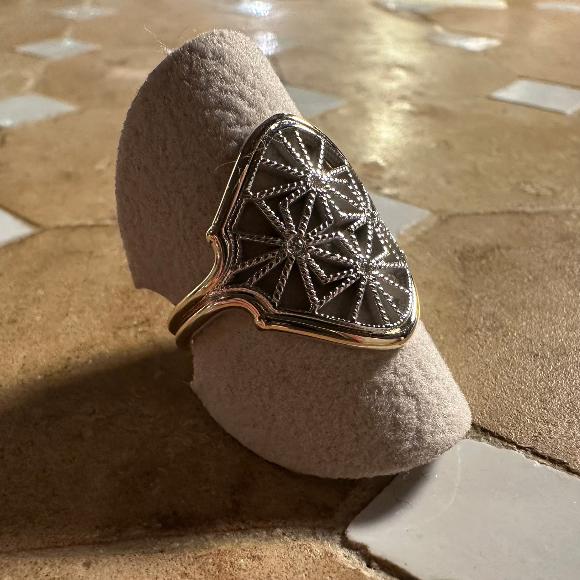 In sorgfältiger Handarbeit aus 14 Karat Gelbgold und Weißgold gefertigt, zeigt der Ring ein ornamentales, blütenähnliches Muster, das im Licht wie ein kaiserliches Mosaik erstrahlt.