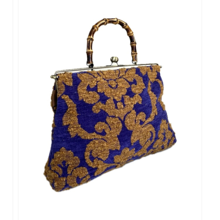 “La Viola” vereint kunstvolle Textur, kräftige Farbe und einen Hauch Retro-Charme. Der Körper der Tasche besteht aus tief lilafarbenem Orca-Stoff, verziert mit einem goldbraunen floralen Reliefmuster, das ihre opulente und zugleich warme Ausstrahlung prägt.