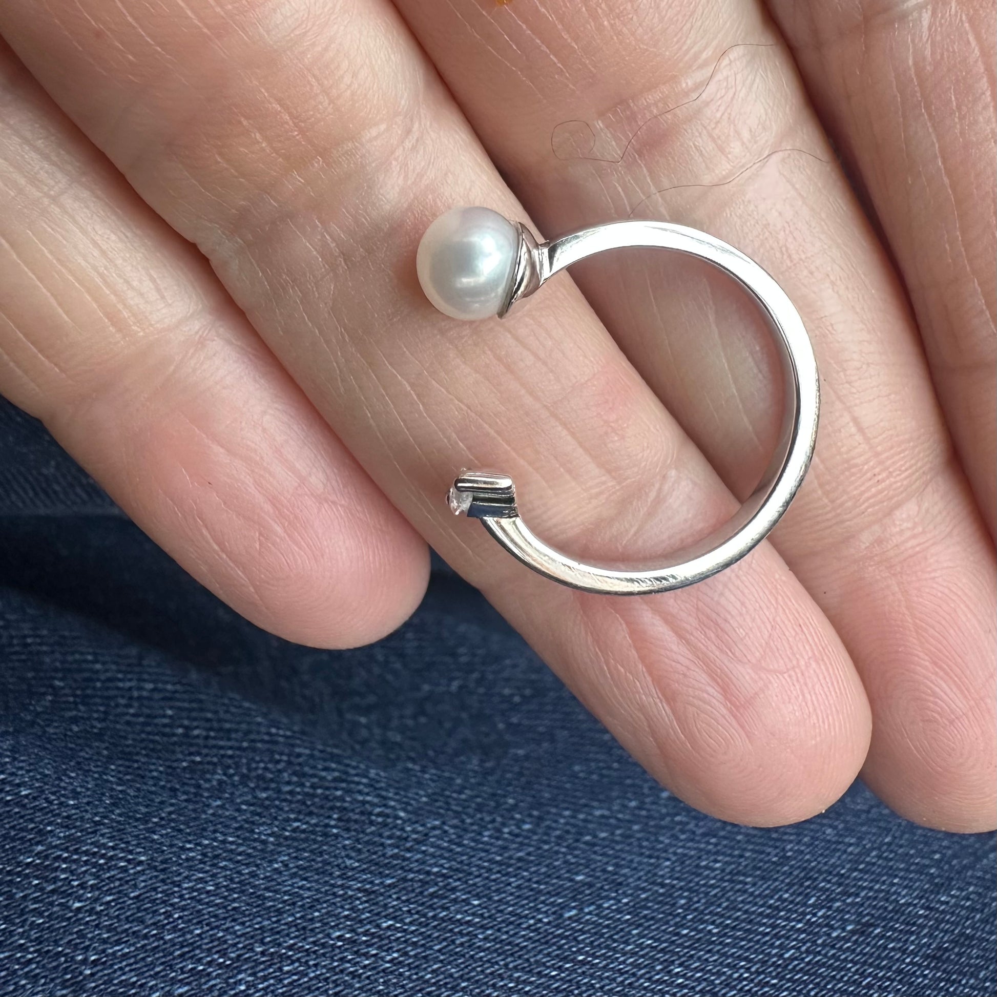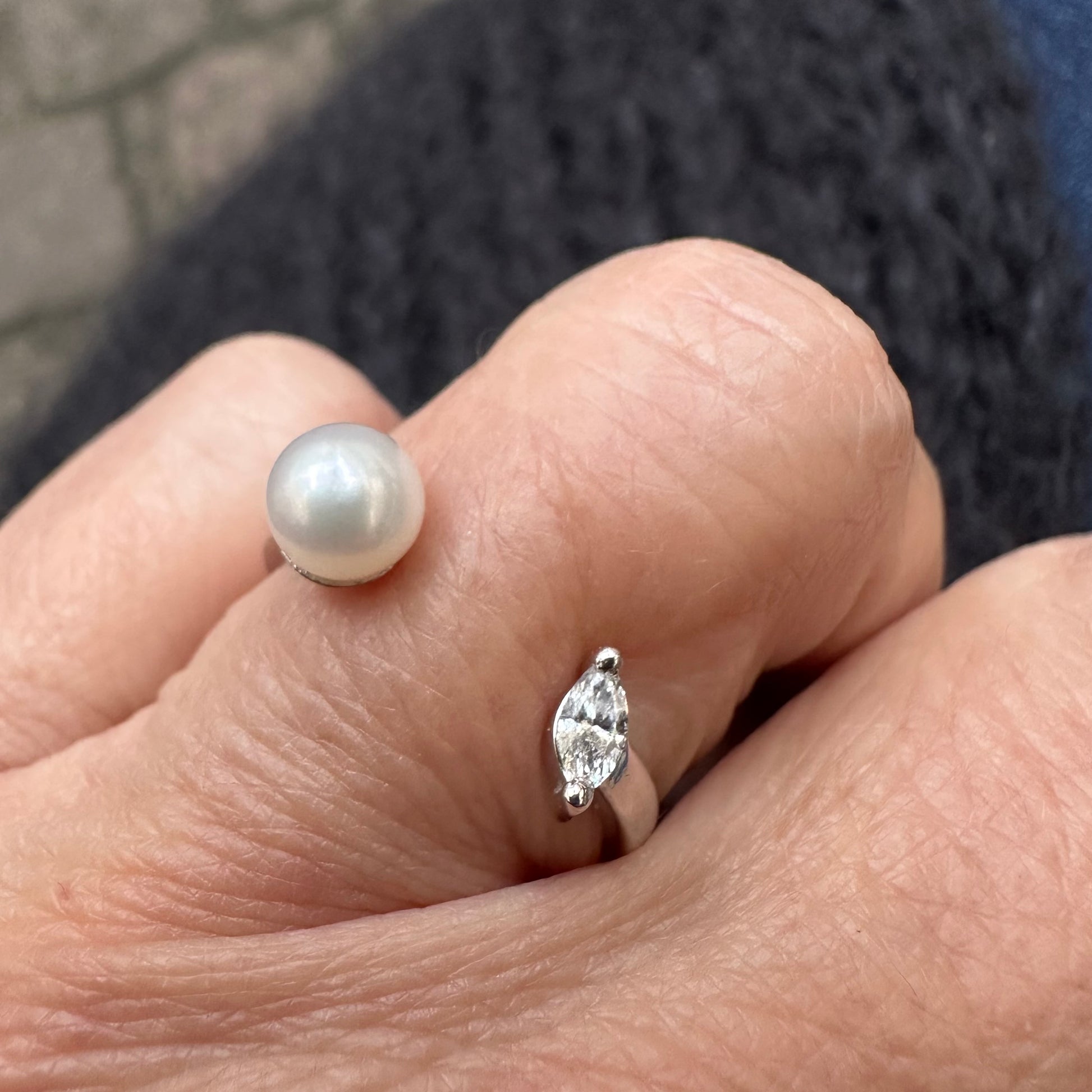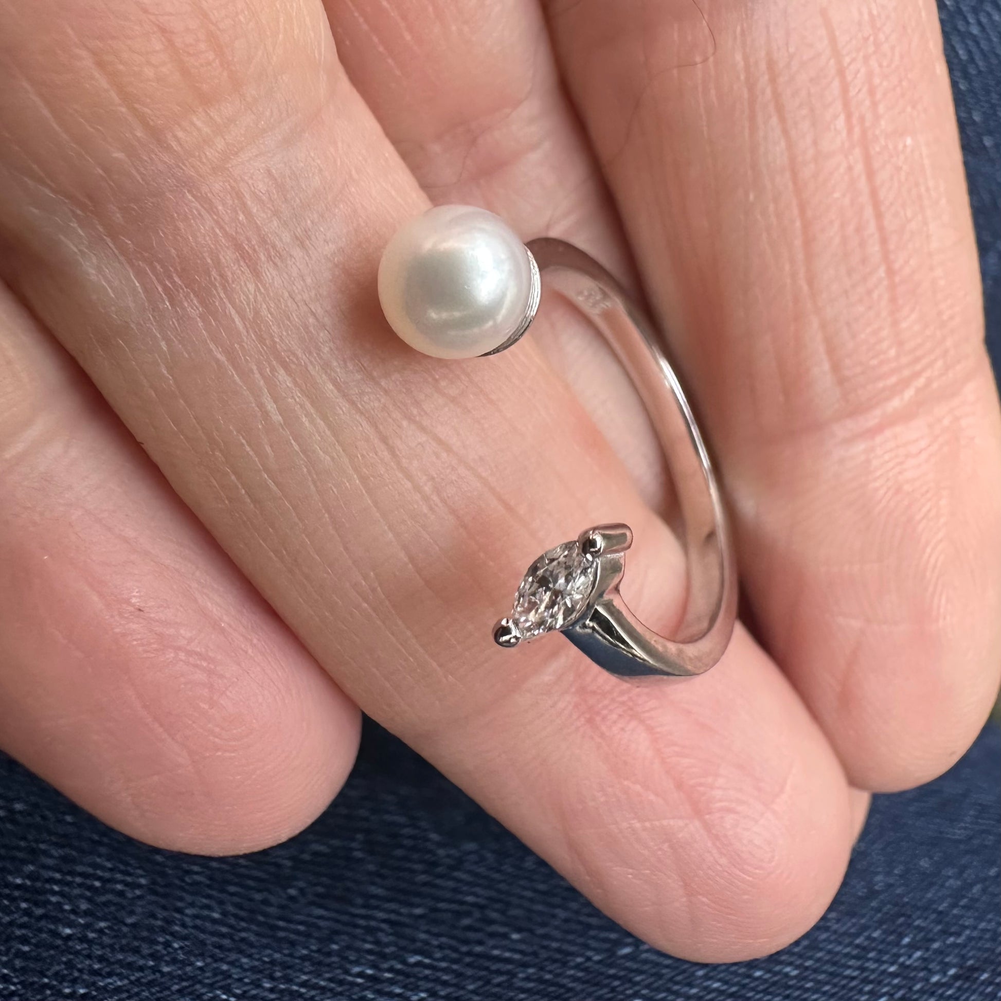Ein moderner Open-Ring, der zeitlose Eleganz und zurückhaltende Luxus vereint. Auf der einen Seite sitzt ein filigraner Diamant im Marquise-Schliff, auf der gegenüberliegenden eine sanft schimmernde Süßwasser-Zuchtperle. Durch das offene Design passt sich der Ring spielerisch dem Finger an und sorgt für eine besonders leichte, fast schwebende Optik.
