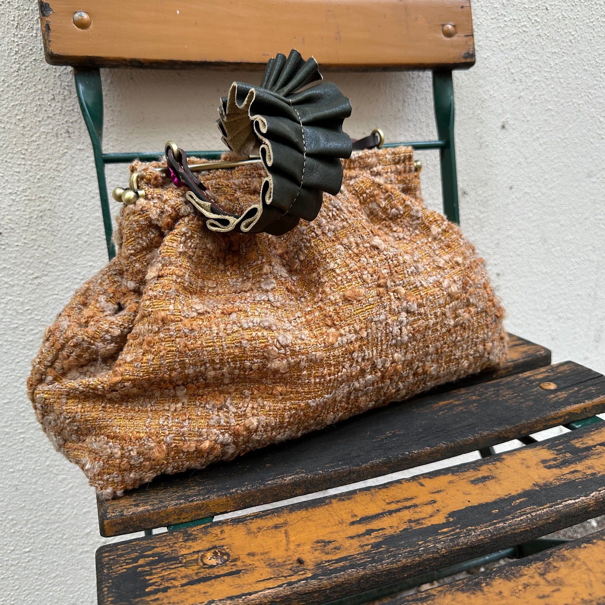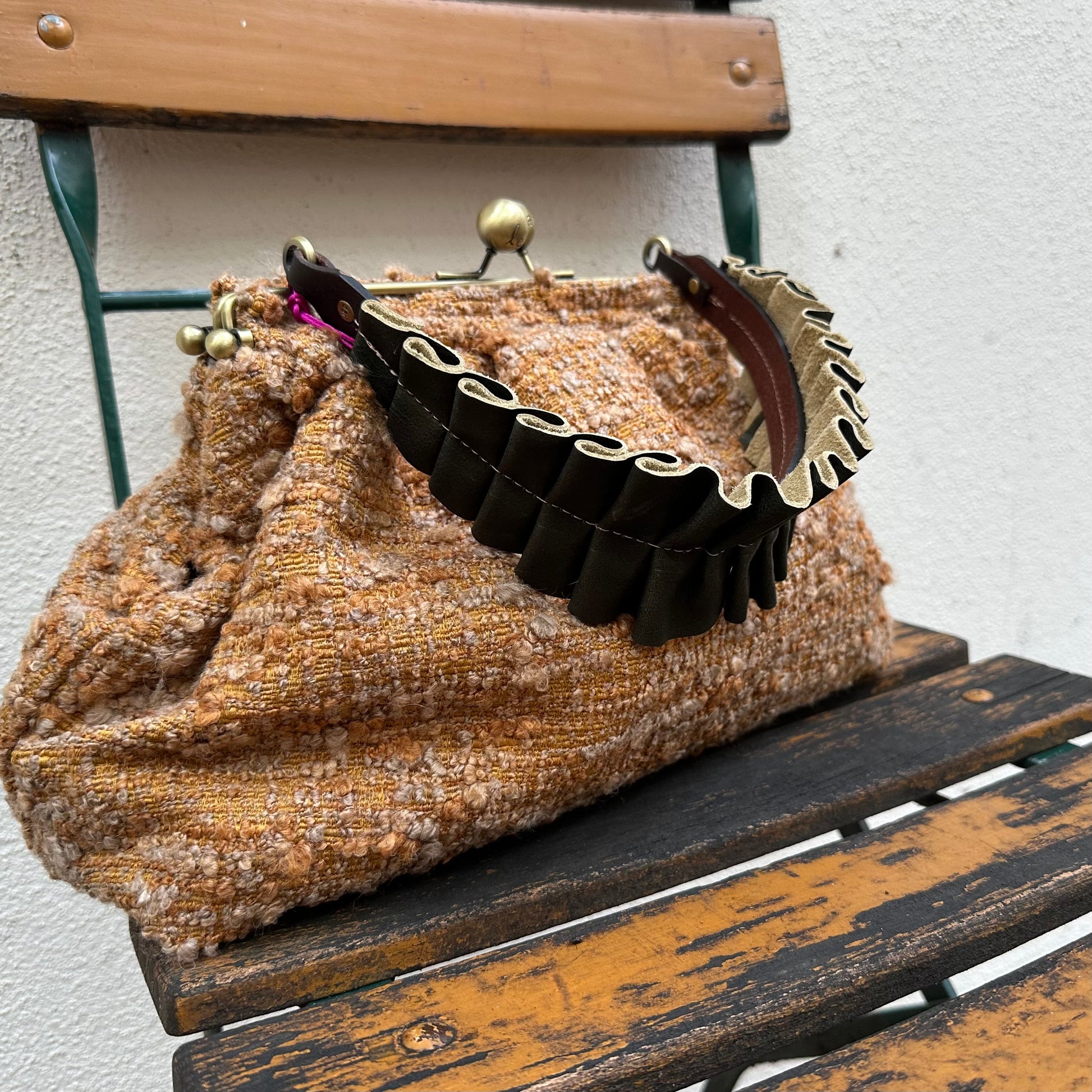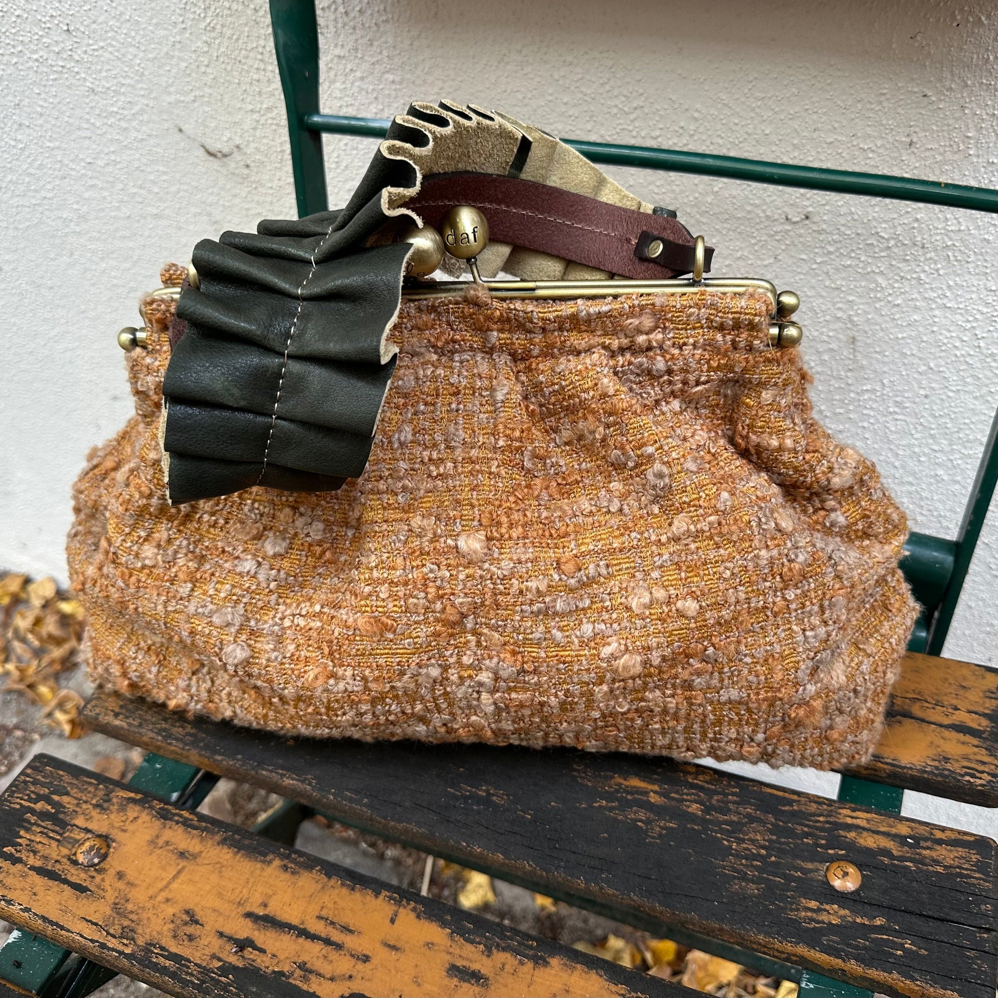 „Onda Verde“ verbindet warme Ockertöne mit einem markanten, tiefgrünen Ledergriff – eine ausdrucksstarke, zugleich sehr weiche Farbkombination. Die Tasche ist aus strukturiertem Stoff gefertigt, dessen lebendige Oberfläche an handgewebten Bouclé erinnert. Der aufwendig gefaltete Ledergriff ist ein besonderes Detail: er liegt angenehm in der Hand und setzt einen spannenden, skulpturalen Akzent.