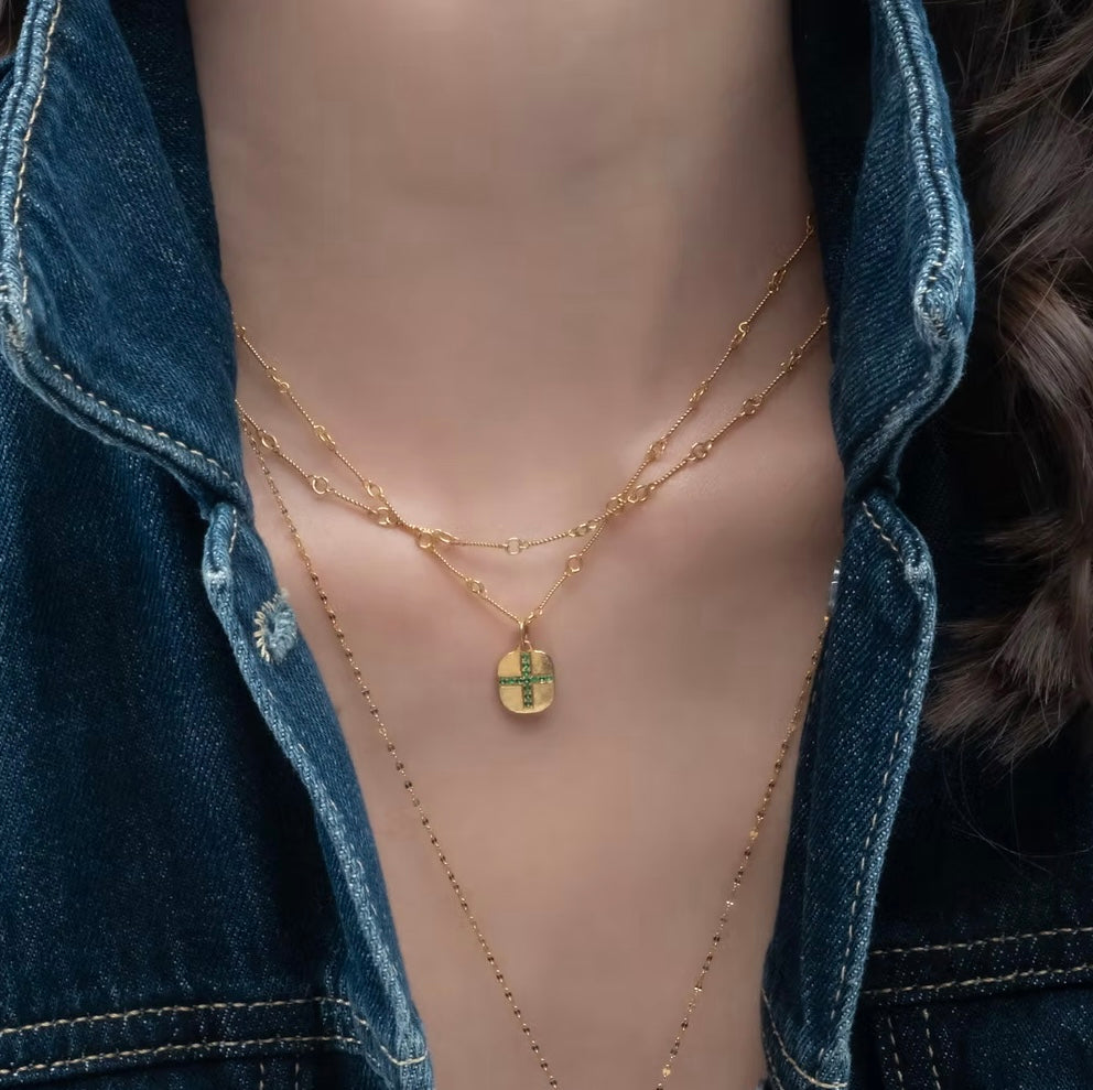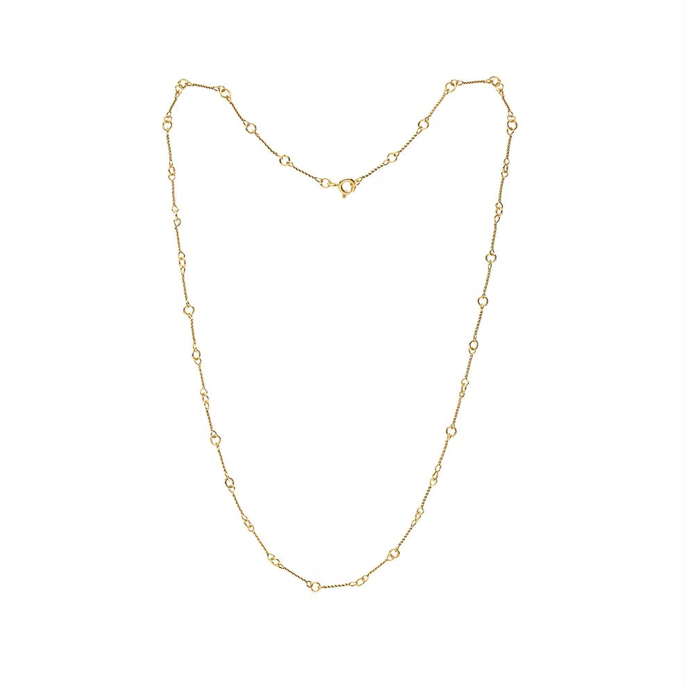 Twist & Loop ist eine feine, handgefertigte Kette aus 14 Karat Gelbgold, deren rhythmisches Gliederdesign aus gedrehten Elementen und kleinen Rundösen ihr einen eleganten, modernen Charakter verleiht. Die Kette ist 43cm lang und liegt harmonisch am Hals, wodurch sie sich perfekt für den Alltag, besondere Anlässe oder Layering mit weiteren Goldketten eignet.